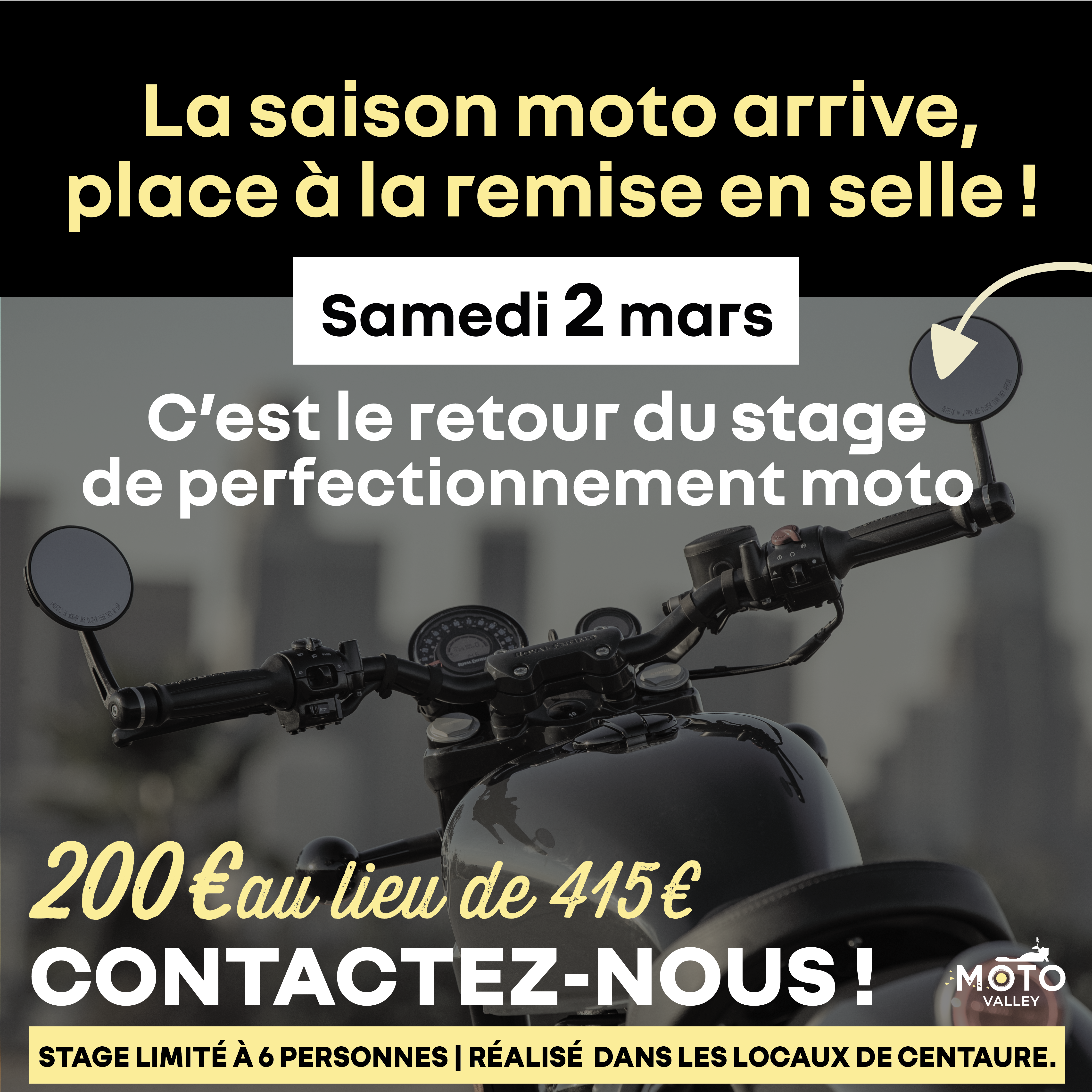 Envie de vous remettre en selle, gagner en assurance pour rouler en toute sérénité ? Le MotoValley vous offre la possibilité de réaliser un stage de perfectionnement moto le samedi 2 mars au centre de formation Centaure situé à Hénin Beaumont.